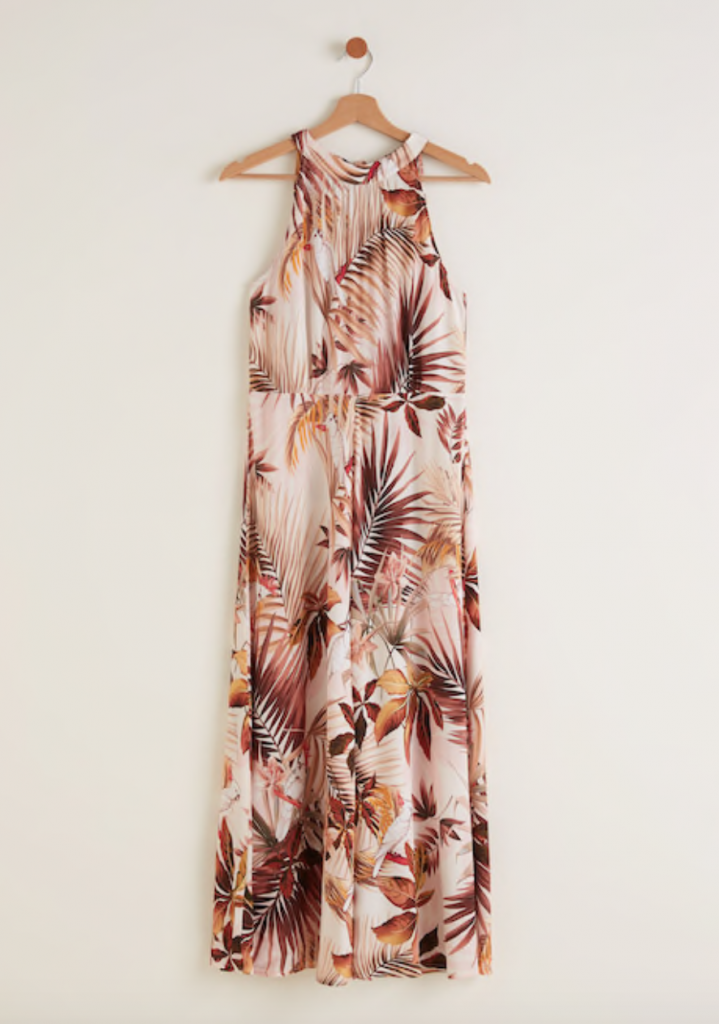 Αυτή τη φορά θα μιλήσουμε για ένα φόρεμα από τα Mango, τα οποία έτσι κι αλλιώς φέτος έχουν μια εκπληκτική συλλογή που μπορεί να σας καλύψει για κάθε περίσταση. Έχει πολύ κολακευτική γραμμή για κάθε σωματότυπο και το τέλειο μήκος για να φορεθεί σε έναν γάμο που γίνεται αυτή την περίοδο. Το μοτίβο του επίσης είναι πολύ καλοκαιρινό και παραπέμπει σε διακοπές και καλοπέραση ενώ οι γήινες αποχρώσεις του ταιριάζουν απόλυτα και με τη μαυρισμένη σας επιδερμίδα. Μπορείτε να το συνδυάσετε με μία ζώνη, αν θέλετε να κάνετε τη σιλουέτα σας πιο θηλυκή, ενώ επιπλέον ταιριάζει τόσο με ψηλοτάκουνα παπούτσια, όσο και με σανδάλια, ανάλογα με το πού θέλετε να το φορέσετε. Μπορείτε να το συνδυάσετε επιπλέον με όλα σας σχεδόν τα αξεσουάρ γιατί παρά το ξεχωριστό του μοτίβο είναι αρκετά ουδέτερο, έτσι δε θα δυσκολευτείτε να βρείτε τον ιδανικό τρόπο να το φορέσετε.