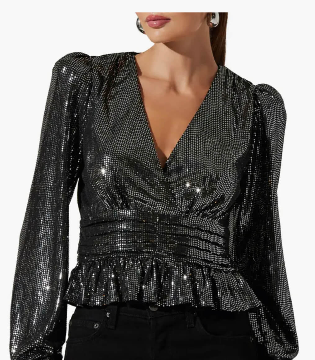 Αναβαθμίζουμε το γιορτινό στιλ με ένα peplum top γεμάτο παγιέτες και λάμψη. Ιδανικό για τις βραδινές εμφανίσεις, το συνδυάζουμε με μαύρο στενό παντελόνι και ψηλοτάκουνα πέδιλα.