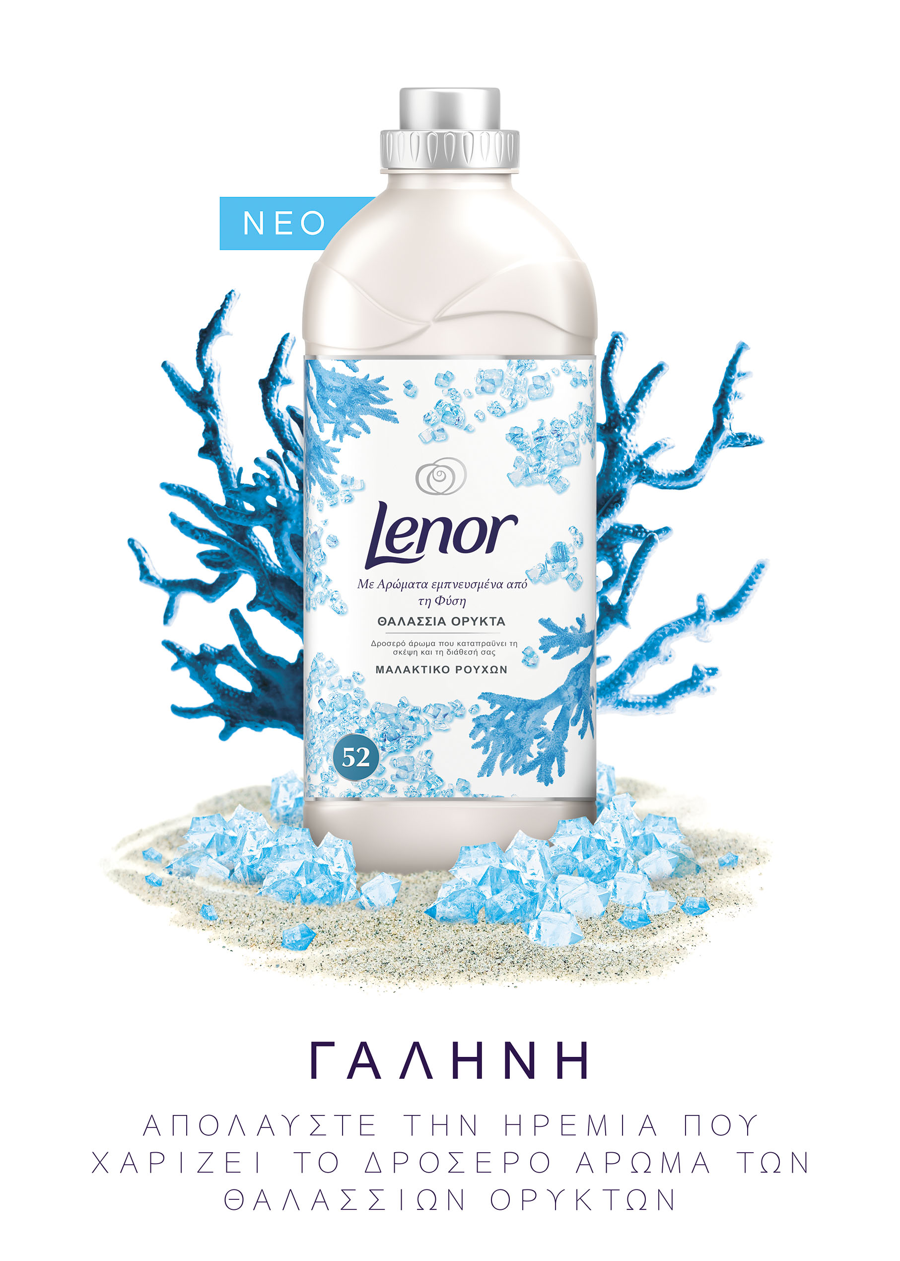 Θαλάσσια ορυκτά: Ένα χαλαρωτικό άρωμα με βασικές νότες που θυμίζουν θάλασσα. Ο αρωματοποιός του Lenor, Rafael Trujillo, λέει: «Αυτό το άρωμα με μεταφέρει στην παραλία. Το ελαφρύ αεράκι, το απαλό κύμα και ο καυτός ήλιος, μας φέρνουν απίστευτη ηρεμία και μας κάνουν να εκτιμάμε τη δύναμη της φύσης.»