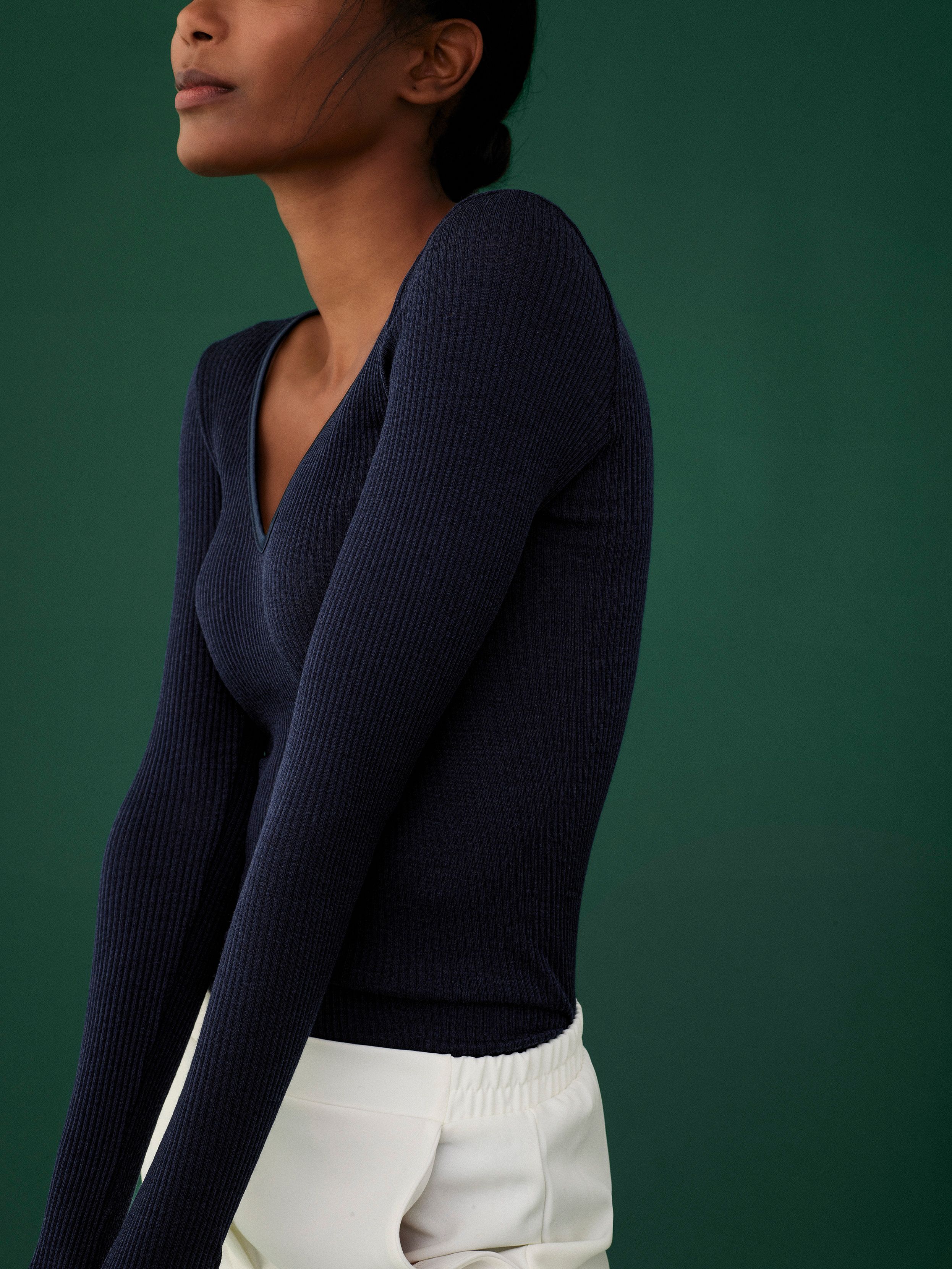 Η ριπ πλέξη υπογραμμίζει την ποικιλία της Wool & Silk σειράς περιλαμβάνοντας ένα πόλο με ζιβάγκο πουλόβερ σε σκούρα πράσινη απόχρωση, μία μακρυμάνικη μπλούζα με βαθύ V και μία must-have αμάνικη μπλούζα με V λαιμόκοψη. Η καινούργια πλεκτή μπλούζα με κοντό ζιβάγκο χωρίς ραφές ξεχωρίζει στον ζεστό και πρωτότυπο τόνο της καφέ μόκα. Άλλα απαραίτητα κομμάτια της γκαρνταρόμπας αποτελούν το διαχρονικό πουλόβερ με στρογγυλή λαιμόκοψη, ένα key piece για casual αλλά μοντέρνα looks.
