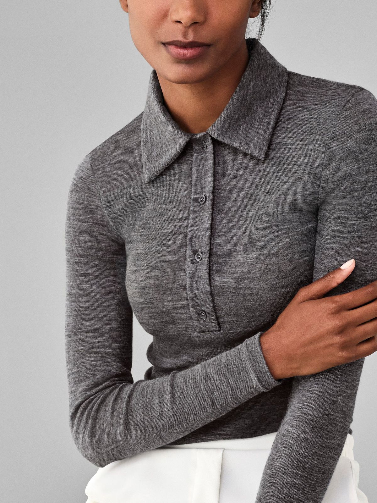 Πλέον τα sporty-chic στιλ είναι must, αφού είναι δημιουργικά, δυναμικά inspo για casual ντύσιμο με έντονο χαρακτήρα. Για τη συλλογή, η Intimissimi έχει δημιουργήσει μία νέα μακρυμάνικη μπλούζα πόλο, ένα κλασικό καινοτόμο ρούχο με γιακά, με χρήση απλών πλεκτών Wool & Silk νημάτων. Φτιαγμένο από πολυτελή υλικά, το γοητευτικό αυτό κομμάτι είναι διαθέσιμο σε διαφορετικές αποχρώσεις, συμπεριλαμβανομένου του iconic γκρι.