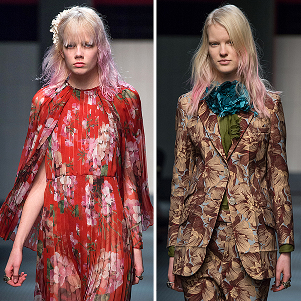 Βλέπετε, ο Alessandro Michele, ο νέος Creative Director του οίκου, λάτρευε την Courtney Love την εποχή που οι Hole μεσουρανούσαν και τότε η Courtney είχε δίχρωμα μαλλιά. Αποφάσισαν λοιπόν πως 2 outfits θα ήταν τέλεια με ροζ μαλλιά και έτσι έγινε. Δύο από τα μοντέλα απέκτησαν ροζ, πολύ ανοιχτές, παστέλ ροζ άκρες και περπάτησαν στην πασαρέλα με το πιο φρέσκο look. Ο αέρας της αλλαγής φαίνεται φύσηξε για τον οίκο κι εμάς μας ενθουσίασε το χρώμα και η κίνηση παρ’ όλο που ίσως να μην το τολμούσαμε.