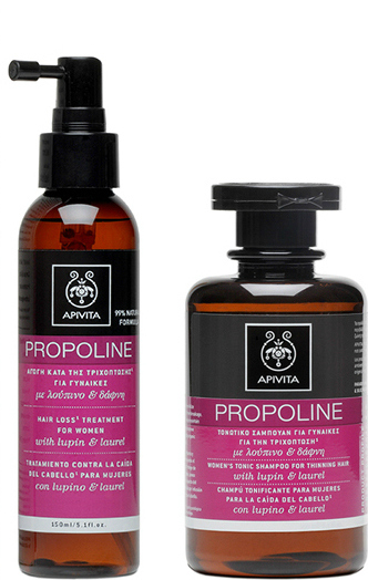 Η πρώτη αγωγή που λατρέψαμε είναι η σειρά της Propoline από την Apivita κατά της τριχόπτωσης για γυναίκες (κυκλοφορεί και εξειδικευμένη αγωγή για άντρες), η οποία αποτελείται από ειδικό σαμπουάν, τονωτικό σπρέι για τις ρίζες των μαλλιών και συμπλήρωμα διατροφής σε μορφή κάψουλας.