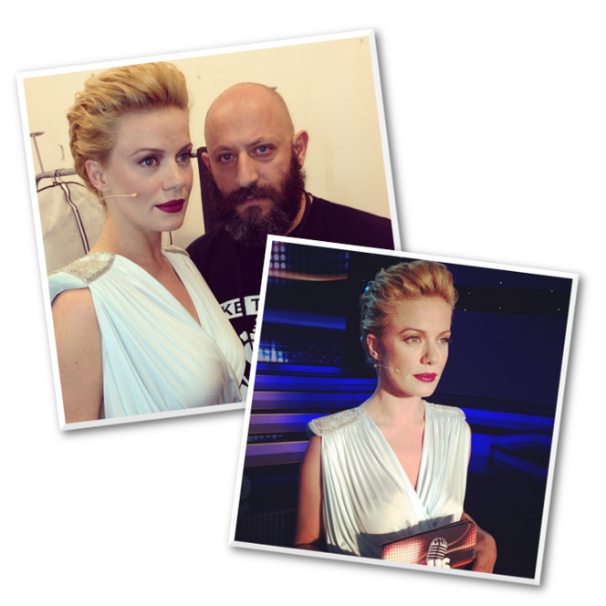 «Για αυτό το live θέλαμε ένα minimal μακιγιάζ. Το ρούχο της ήταν ήδη πολύ φορτωμένο και έτσι δεν ταίριαζε κάτι πιο βαρύ. Γι’ αυτό και ο Στέφανος Βασιλάκης έπιασε αυτό το ανάλαφρο σινιόν», μας είπε ο Γιάννης και συνέχισε να μας εξηγεί: «Στο πρόσωπο χρησιμοποίησα λίγο Whipped Cream Foundation και ελάχιστο Creme Puff της Max Factor, τόσο ελαφρύ που φαίνονταν μέχρι και οι φακίδες της». Έτσι δημιουργήθηκε μια τέλεια βάση επάνω στην οποία ο Γιάννης, για ακόμα μια φορά, ζωγράφισε. «Στα μάγουλα χρησιμοποίησα το Flawless Perfection Blush No 220 που δεν έχει καθόλου κίτρινο στη βάση του κι έτσι δεν είναι σκληρό».