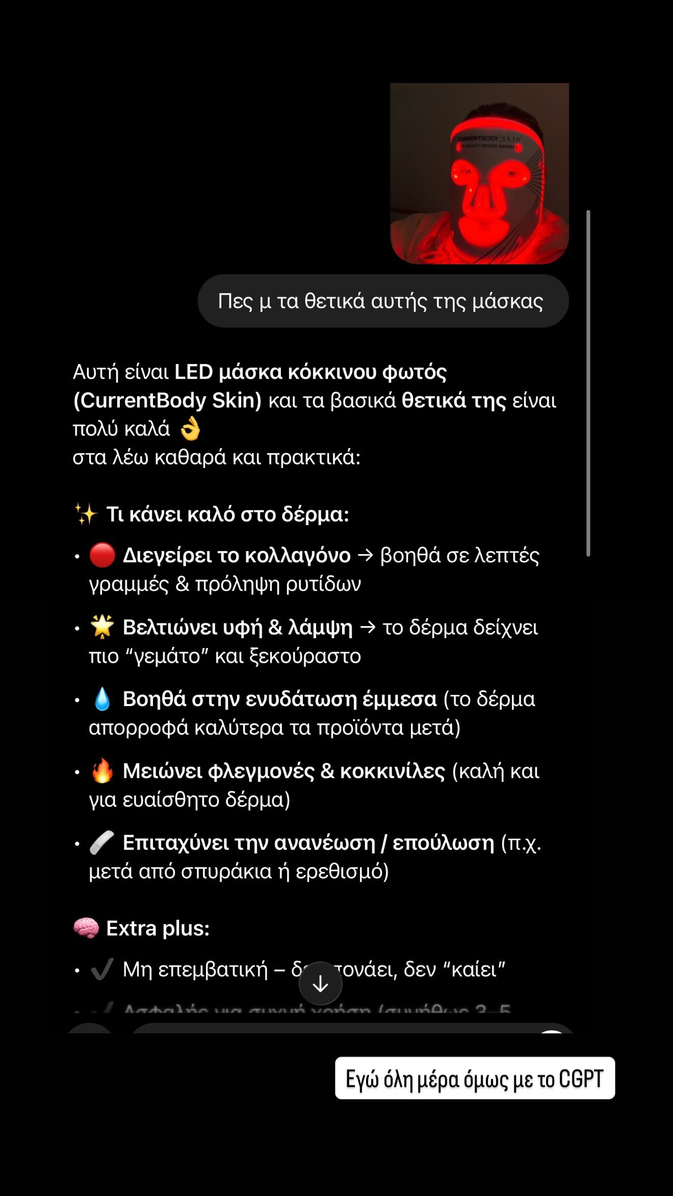 Σε δεύτερο story, η Γαρυφαλλιά Καληφώνη εξήγησε με τη βοήθεια του ChatGPT πως η led μάσκα κόκκινου φωτός: