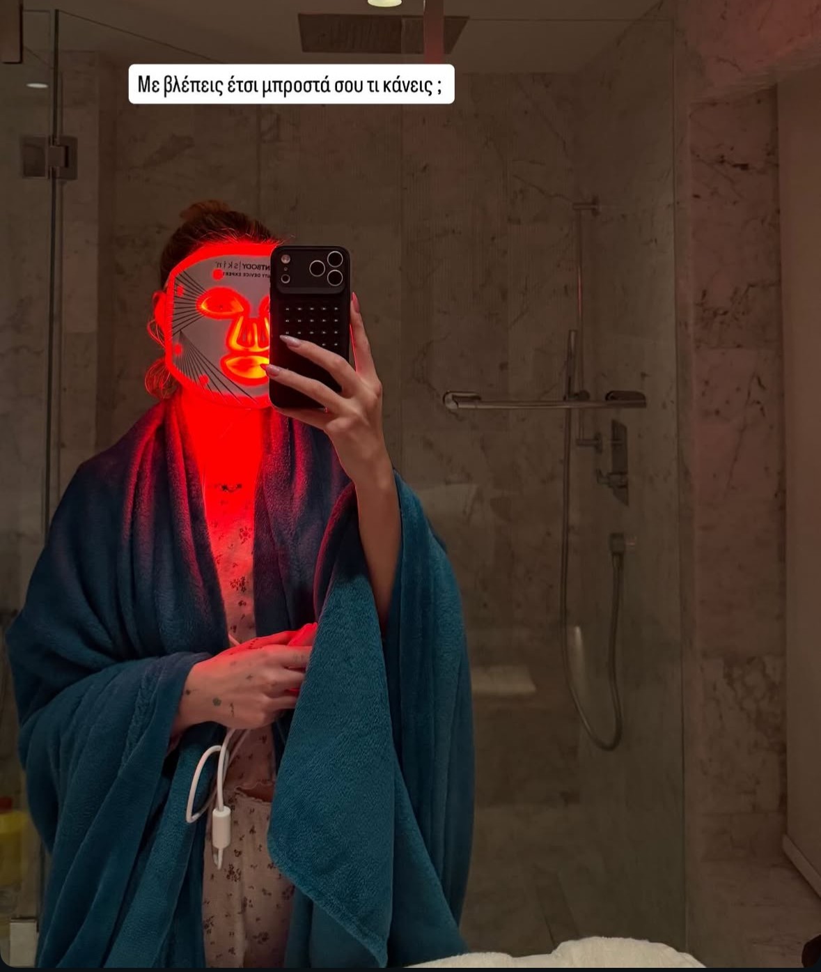 Σε αυτή, το μοντέλο και influencer ποζάρει μπροστά στον καθρέπτη φορώντας στο πρόσωπο LED μάσκα κόκκινου φωτός. «Με βλέπεις έτσι μπροστά σου, τι κάνεις;» έγραψε με μία δόση χιούμορ η Γαρυφαλλιά Καληφώνη, ενώ στη συνέχεια εξήγησε αναλυτικά τα οφέλη της συγκεκριμένης μάσκας στην επιδερμίδα της!