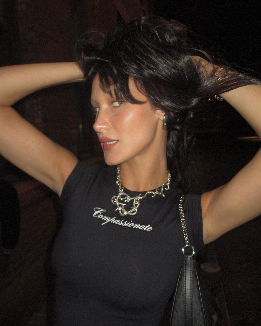 Η Bella Hadid διατήρησε αυτό το νέο beauty look της απλό, έχοντας εφαρμόσει μόνο ένα ροζ-nude κραγιόν στα χείλη.