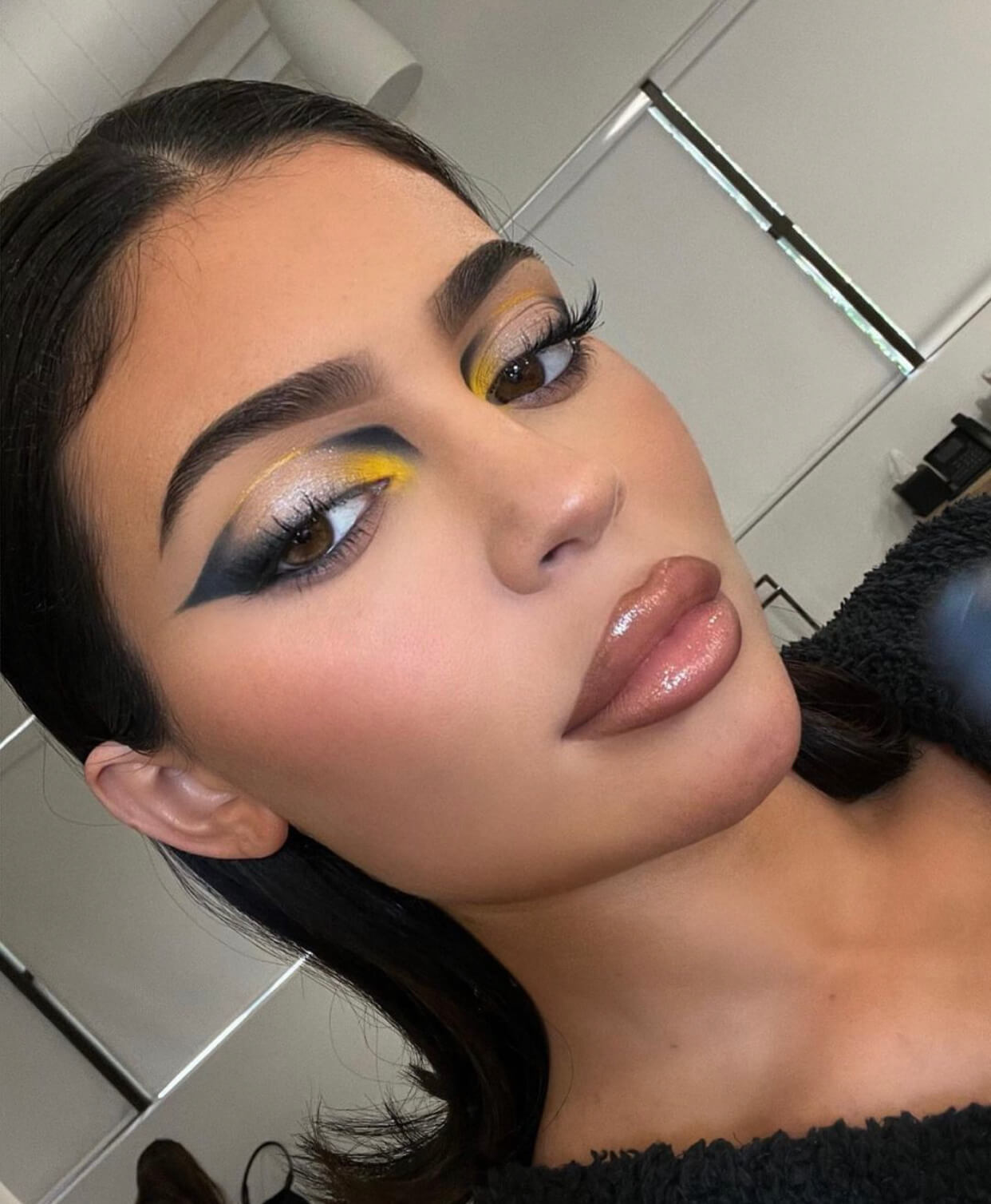 Αυτό το γεωμετρικό makeup look που δίνει ιδιαίτερη έμφαση στα μάτια μάς κάνει να αγαπήσουμε λίγο παραπάνω την κίτρινη σκιά. Η Kylie δημιούργησε το πιο αιχμηρό αποτέλεσμα, συνδυάζοντας το κίτρινο χρώμα με το μαύρο και τη διακριτική λάμψη με την cat eye τεχνική, διατηρώντας το υπόλοιπο beauty look σε nude τόνους και ποντάροντας απλά στο glossy εφέ.