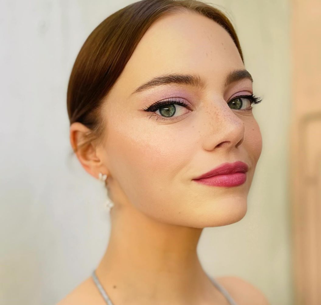 Και αυτή τη φορά, η Emma Stone συνεργάστηκε με τη διάσημη makeup artist Rachel Goodwin για ένα ονειρικό μακιγιάζ σε τόνους της λεβάντας, με ένα διακριτικό winged eyeliner και ένα φωτεινό τριανταφυλλί κραγιόν. Ταυτόχρονα, η κομμώτρια Mara Roszak της έφτιαξε ένα χαμηλό σινιόν με δυο ελεύθερες μικρές τούφες που κάνουν πιο ανάλαφρο και ρομαντικό το αποτέλεσμα.