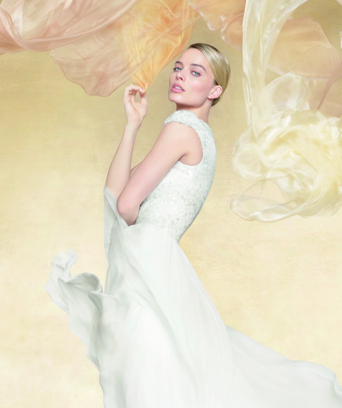 Η λαμπερή Margot Robbie βρίσκεται στο κέντρο μιας δίνης από λευκά και χρυσά πέπλα στα οποία δίνει αιθέρια κίνηση υπό τους ήχους της μουσικής του τραγουδιού Halo της Beyoncé.