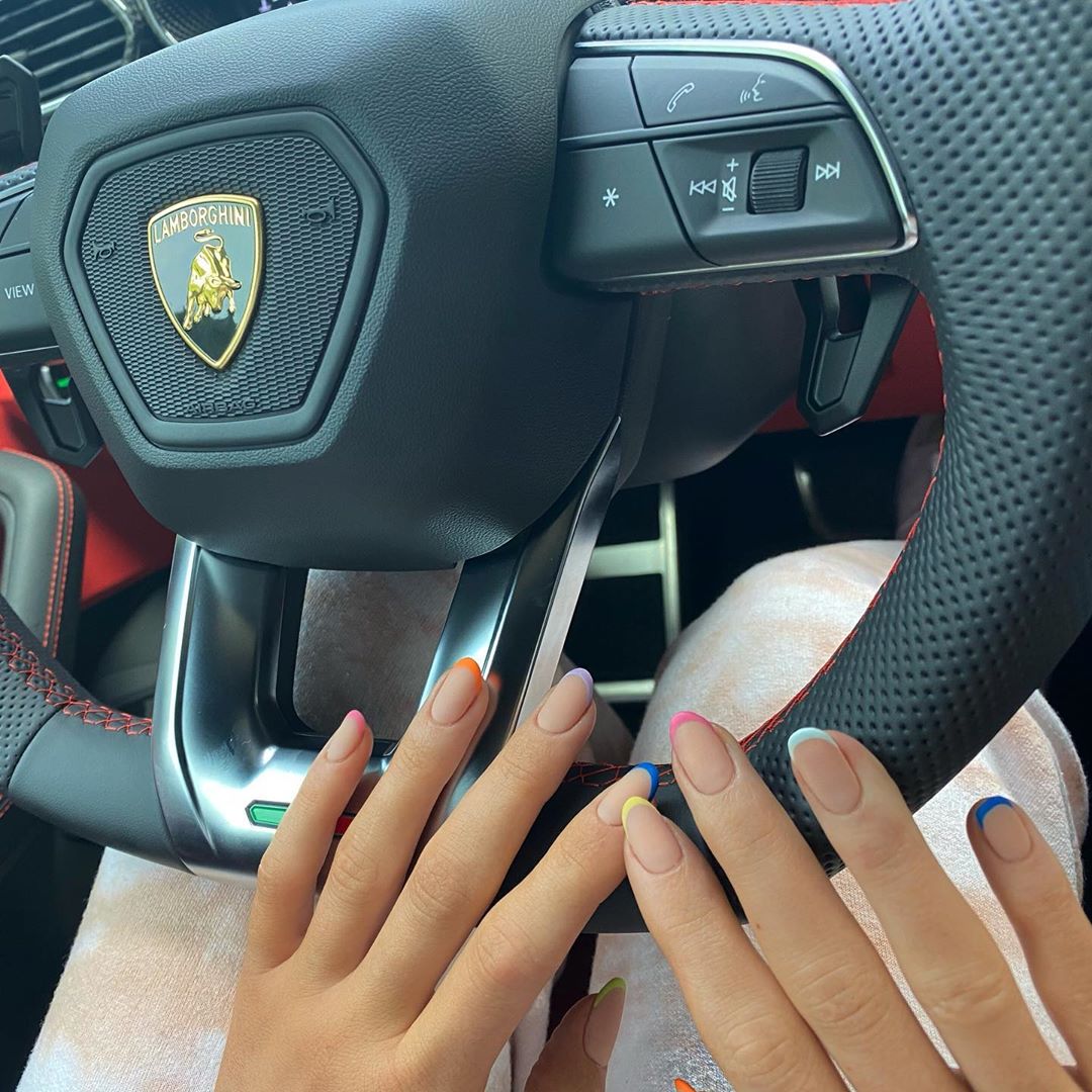 Η Kylie Jenner έκανε το γνωστό σε όλες μας γαλλικό μανικιούρ, μόνο που αντί για την κλασική λευκή γραμμή χρησιμοποίησε διάφορα έντονα χρώματα όπως το ροζ, το γαλάζιο, το πορτοκαλί κλπ. Το αποτέλεσμα είναι πολύ ανοιξιάτικο και girly.
