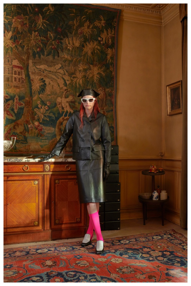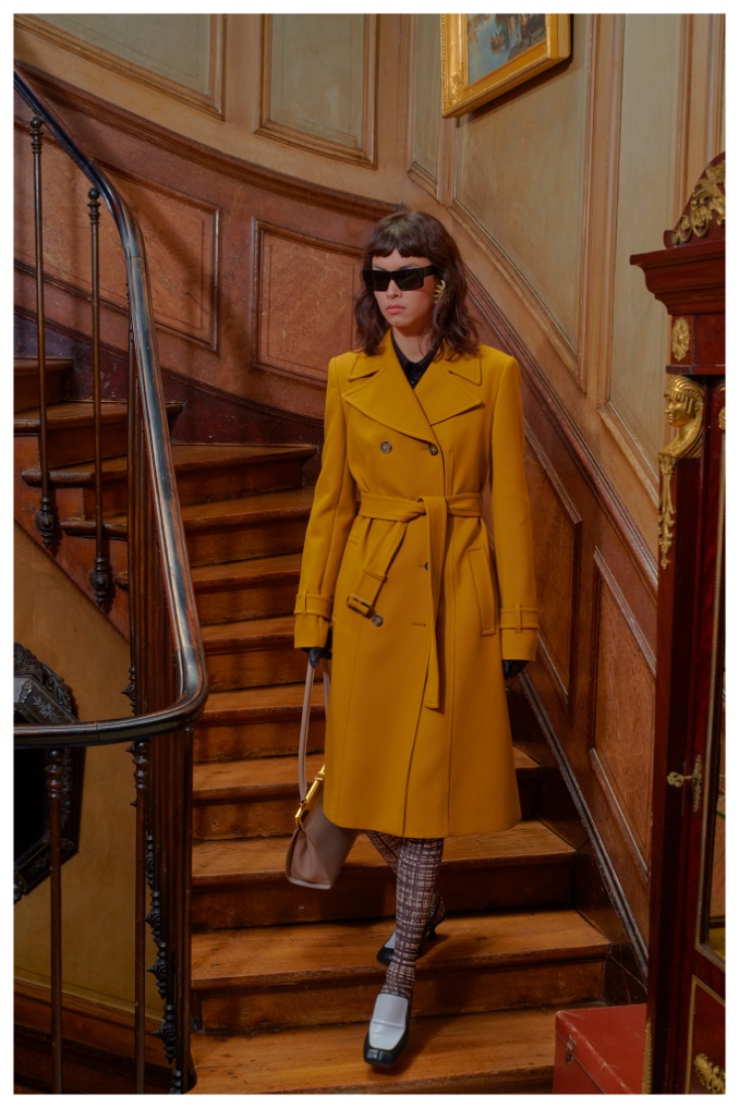 Μια σειρά από δερμάτινα looks μεταδίδουν τη συνολική διάθεση της συλλογής, όπως το tailored savvy στυλ της δεκαετίας του 1960, που επαναπροσδιορίζεται μέσα από ένα jacket με boxy σιλουέτα, μια εμβληματική καπαρντίνα σε κεραμιδί απόχρωση, που συνδυάζεται με μια κομψή μακριά tube φούστα.