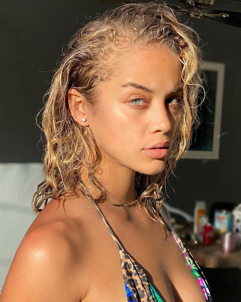 Οι πανέμορφες μπούκλες της αναδεικνύονται από το ξανθό μελί χρώμα, δίνοντάς της ένα λαμπερό αποτέλεσμα.
