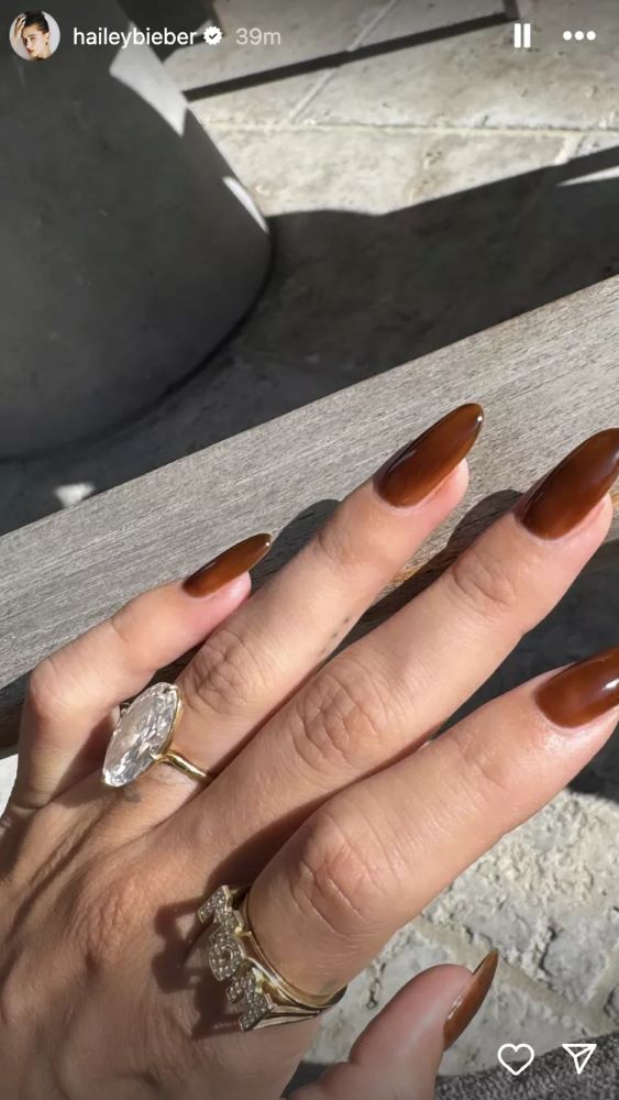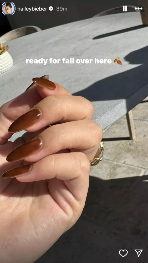Η ιδρύτρια της Rhode ανάρτησε μια κοντινή φωτογραφία από το νέο της μανικιούρ στο Instagram. Τράβηξε μια φωτογραφία των αμυγδαλωτών νυχιών της, βαμμένα στην απόχρωση του κάστανου, γράφοντας στη λεζάντα “Έτοιμη για το φθινόπωρο εδώ”. Το ζεστό καφέ χρώμα είναι παρόμοιο με το χρώμα των φύλλων, του κεχριμπαριού ή της ταρταρούγας, και είναι μια απόχρωση που δεν έχουμε ξαναδεί στη Bieber.