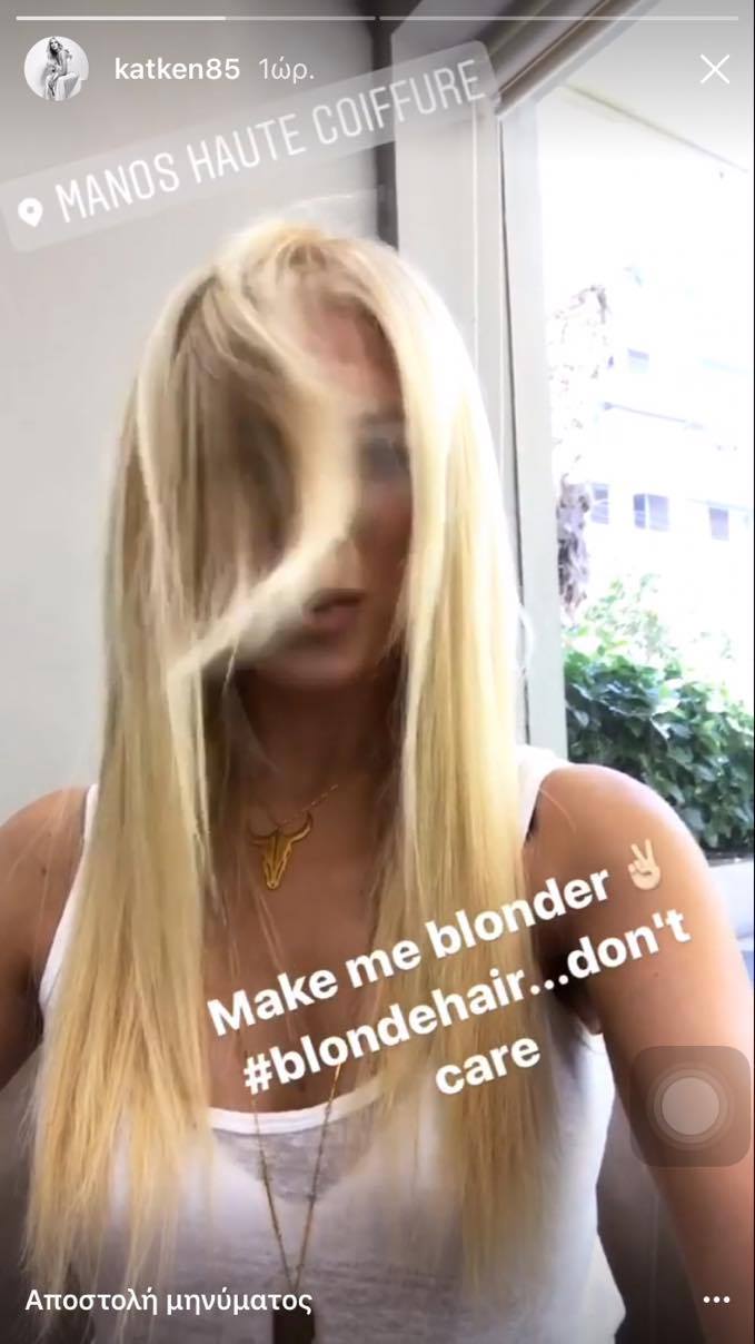 Η τελευταία της επίσκεψη στο κομμωτήριο είχε ως στόχο να την κάνει ακόμα πιο ξανθιά. «Make me blonder. Blonde hair, don’t care» έγραψε η ίδια στη φωτογραφία που ανάρτησε στα stories του instagram, αποκαλύπτοντας πως έχει αφεθεί ξανά στα χέρια του αγαπημένου της κομμωτή, Μάνου Κοψαχείλη.
