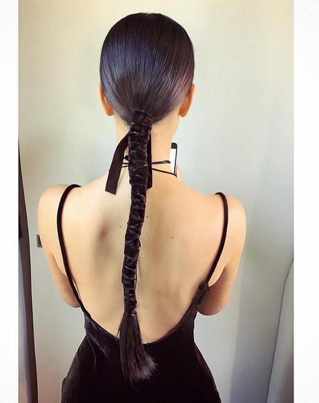 Ο hair stylist της Kim, Chris Appleton, δημιούργησε μία sleek κοτσίδα στη βάση του αυχένα και στη συνέχεια τύλιξε γύρω της μία βελούδινη κορδέλα. Η τηλεπερσόνα συνδύασε την κορδέλα με ένα εξώπλατο βελούδινο φόρεμα Donna Karan, του οποίου η απλή γραμμή ταίριαξε τέλεια με το μίνιμαλ αυτό χτένισμα. Υπέροχο, δε συμφωνείτε; Εμείς πάντως σκοπεύουμε να το αντιγράψουμε σύντομα, ακόμα κι αν τα μαλλιά μας δεν είναι τόσο μακριά!