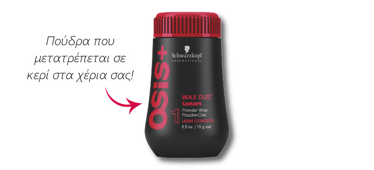 Για τη δημιουργία φυσικού look σε στεγνά μαλλιά η Schwarzkopf Professional σχεδίασε ένα νέο προϊόν με καινοτομική σύνθεση˙ το OSiS+ Wax Dust 14,60€ στα κομμωτήρια. Το Wax Dust θερμαίνεται στο χέρι και η υφή του που μοιάζει με πούδρα, μετατρέπεται σε ένα εξαιρετικά ελαφρύ και κρεμώδες κερί. Οι ειδικοί της Schwarzkopf Professional ανέπτυξαν μια φόρμουλα που συνδυάζει ένα νέο είδος σιλικόνης, διάλυμα σακχάρων και οινοπνεύματος καθώς και γαλακτωματοποιητή, ώστε να δημιουργήσουν ένα κερί με κρεμώδη σύνθεση. Συγκριτικά με άλλα κεριά, τα σωματίδια της πούδρας χαρίζουν μια πιο στεγνή υφή, γεγονός που επιτρέπει τη δημιουργία ατελείωτων πρωτοποριακών look με ελαστικότητα και πλαστικό κράτημα, που διατηρεί τη φυσική κίνηση στα μαλλιά.
