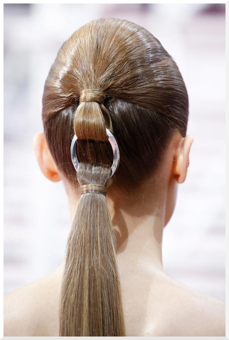 Για τα μαλλιά, ο Guido Palau εμπνεύστηκε από τη δεκαετία του 60 -που ήταν από τις πιο σοφιστικέ και με έμφαση στα αξεσουάρ. Τα μαλλιά τραβήχτηκαν πίσω μεταξένια -και χωρίς όγκο από τη γραμμή του μετώπου- και δόθηκε όγκος σταδιακά πλησιάζοντας προς την κορυφή.  Τέλος, δύο μεταλλικοί ή έντονα χρωματιστοί κρίκοι κράτησαν ή μάλλον, συνέθεσαν,  τα δύο μέρη μιας αλογοουράς που έπεφτε σε ευθεία γραμμή με το κεφάλι φτάνοντας αρκετά χαμηλά.