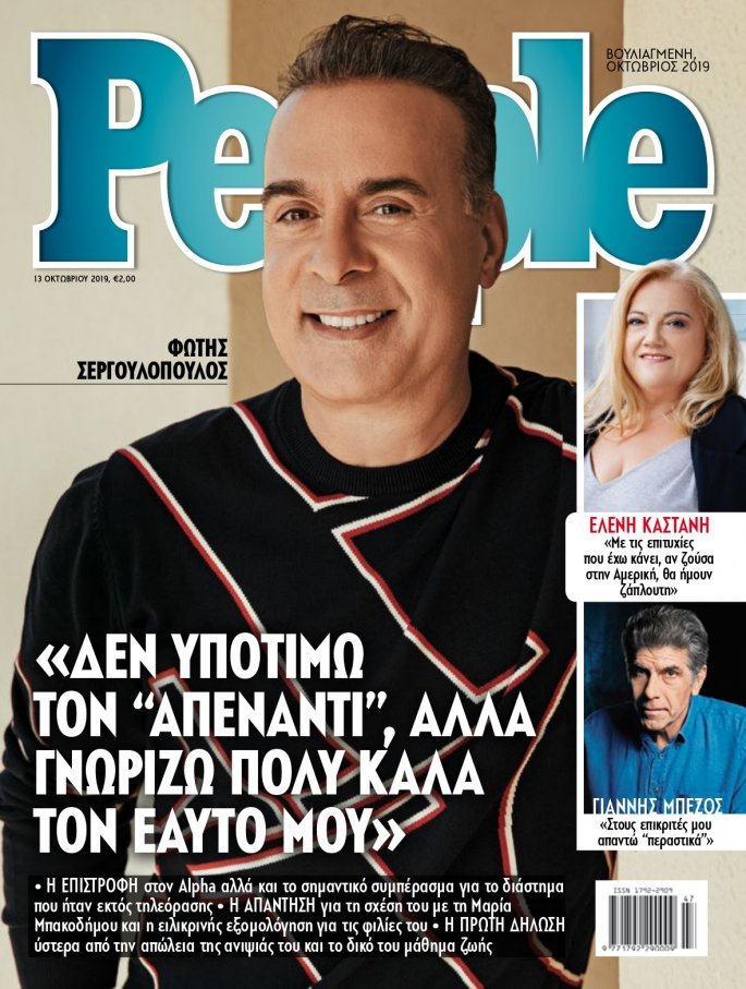 - το PEOPLE: με εξώφυλλο τον Φώτη Σεργουλόπουλο. Λίγο πριν από την επιστροφή του στον Alpha, ο παρουσιαστής μιλάει για το νέο τηλεοπτικό του βήμα, το μιούζικαλ στο οποίο θα συμμετάσχει, την απώλεια της αγαπημένης του ανιψιάς, αλλά και για την σχέση του με τη Μαρία Μπακοδήμου, μια σχέση που σχολιάστηκε έντονα τις τελευταίες ημέρες.