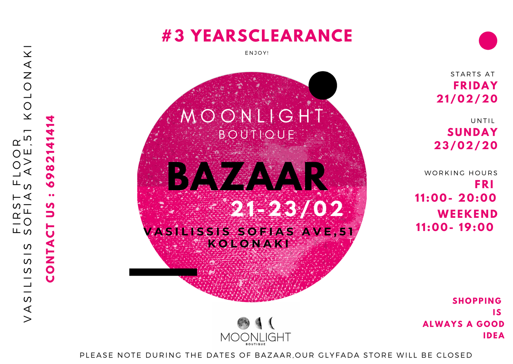 Το αγαπημένο κατάστημα της Γλυφάδας Moonlight Boutique «μετακομίζει» στο Κολωνάκι για 3 μόνο ημέρες, με το πιο in Fashion Bazaar της χρονιάς. Με τιμές από 10 έως και 100 ευρώ σε δημιουργίες Ελλήνων σχεδιαστών, αυτό το τριήμερο δεν υπάρχει άλλος προορισμός. Την Παρασκευή 21, το Σάββατο 22 και την Κυριακή 23 Φεβρουαρίου, το ραντεβού δίνεται στο νούμερο 51 της οδού Βασιλίσσης Σοφίας (1ος όροφος) για shopping με εκπτώσεις μέχρι και 80% σε κομμάτια χειμερινών και καλοκαιρινών συλλογών προηγούμενων χρόνων.