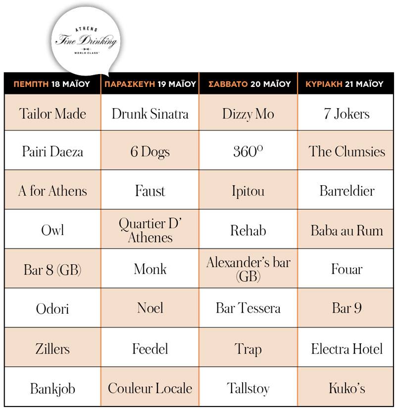 Στο ιστορικό κέντρο της Αθήνας, εκεί όπου «χτυπάει» η καρδιά της πόλης, το World Class, η κορυφαία πλατφόρμα bartending παγκοσμίως, υπό την Αιγίδα του Δήμου Αθηναίων, διοργανώνει το Athens Fine Drinking by World Class, ένα 4ήμερο απολαυστικό εξερευνητικό ταξίδι στη γιορτή του fine drinking. Στο επίκεντρο του Athens Fine Drinking θα βρίσκεται μια μεγαλειώδης σύνθεση από 8 pop-up bars που θα σερβίρουν μοναδικά cocktails με βάση τα πιο premium spirits: βότκα Ketel One, τζιν Tanqueray No. Ten, ρούμι Ron Zacapa, τεκίλα Don Julio, το πολυτελές blend Johnnie Walker Gold Label Reserve, ultra-premium vodka CIROC, American ουίσκι Βulleit και τα δύο single malt ουίσκι Cardhu & Talisker. Τα 32 bars του κέντρου που θα φιλοξενηθούν στα 8 pop-up bars του Παλαιού Χρηματιστηρίου είναι: