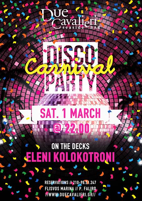 Αυτό το Σάββατο 1η Μαρτίου, το «Due Cavalieri» ή αλλιώς το αγαπημένο Seaside Bar στη Μαρίνα Φλοίσβου μπαίνει σε εντελώς «καρναβαλικούς» ρυθμούς  και μας περιμένει από τις 10 το βράδυ για το Disco Carnival party με την Eleni Kolokotroni να βρίσκεται στα decks.