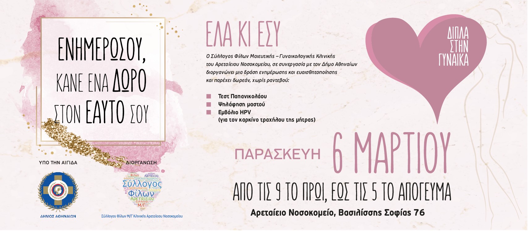 Ο Σύλλογος Φίλων Μαιευτικής- Γυναικολογικής Κλινικής του Αρεταίειου νοσοκομείου με αφορμή την Ημέρα της Γυναίκας (8 Μαρτίου) προσφέρει στις 6 Μαρτίου 2020 -σε συνεργασία με τη Β’ Πανεπιστημιακή Γυναικολογική και Μαιευτική Κλινική του Αρεταίειου Νοσοκομείου- δωρεάν γυναικολογικές εξετάσεις, εξέταση μαστού και εμβολιασμούς για τον καρκίνο του τραχήλου της μήτρας. Η δράση τελεί υπό την αιγίδα του Δήμου Αθηναίων.