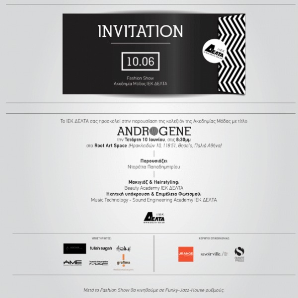 Την Τετάρτη 10 Ιουνίου, στις 20.30 το απόγευμα, το Root Art Space (Ηρακλειδών 10, 118 51, Θησείο, Παλιά Αθήνα), θα μετατραπεί σε ένα εντυπωσιακό σκηνικό πασαρέλας, όπου επαγγελματίες μοντέλα θα παρουσιάσουν τις δημιουργίες των σπουδαστών του Fashion Academy. To styling των μαλλιών και το make up των μοντέλων θα επιμεληθούν αποκλειστικά οι σπουδαστές των τμημάτων Κομμωτικής και Αισθητικής του ΙΕΚ ΔΕΛΤΑ.
