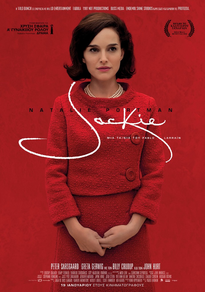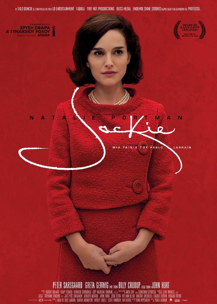Η Natalie Portman (The Black Swan, Thor, V for Vendetta) είναι η Jackie στο ομώνυμο αριστούργημα του ταλαντούχου Χιλιανού σκηνοθέτη Pablo Larraín (No, The Club, Neruda), το οποίο απέσπασε το βραβείο σεναρίου στο Φεστιβάλ Βενετίας 2016, και συνεχίζει να διεκδικεί βραβεία με τη Natalie Portman να είναι υποψήφια για Χρυσή Σφαίρα Καλύτερου Γυναικείου Ρόλου για το 2017.