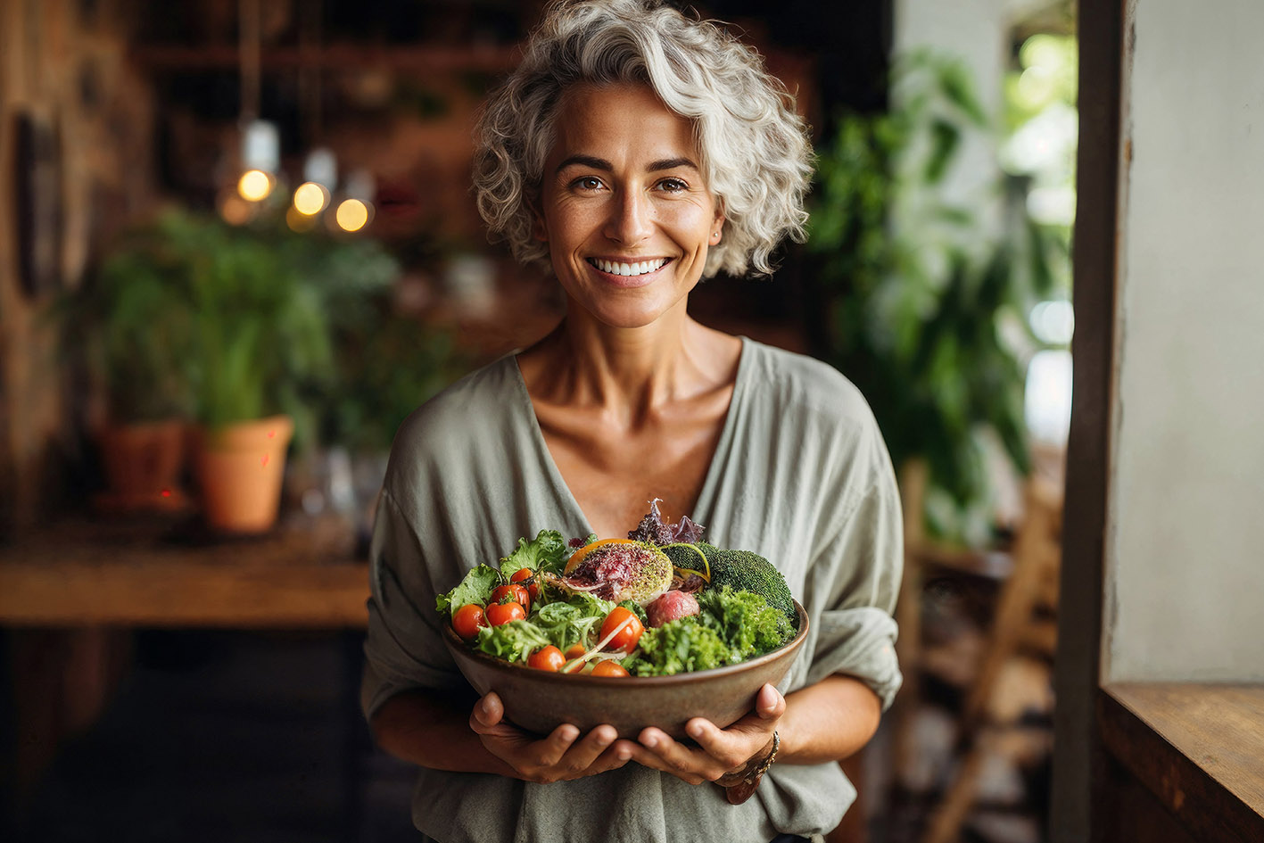 Ευτυχισμένη, χαμογελαστή, ώριμη γυναίκα που κρατά ένα μπολ με φρέσκια σαλάτα και τρώει υγιεινά στην κουζίνα