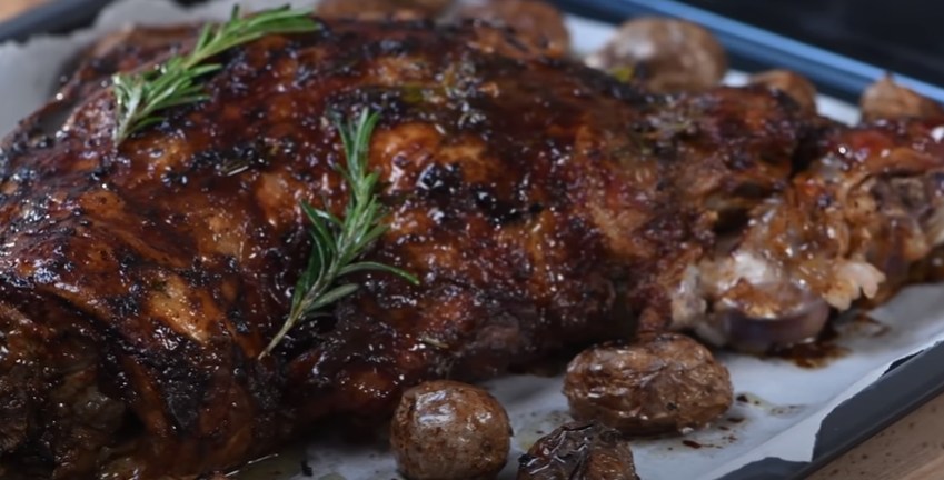 Απλώνουμε με πινέλι πικάντικη μουστάρδα και από τις δυο πλευρές του κρέατος. Περιχύνουμε το μπούτι με παρθένο ελαιόλαδο, το οποίο αλείφουμε σε όλη την επιφάνεια του κρέατος.