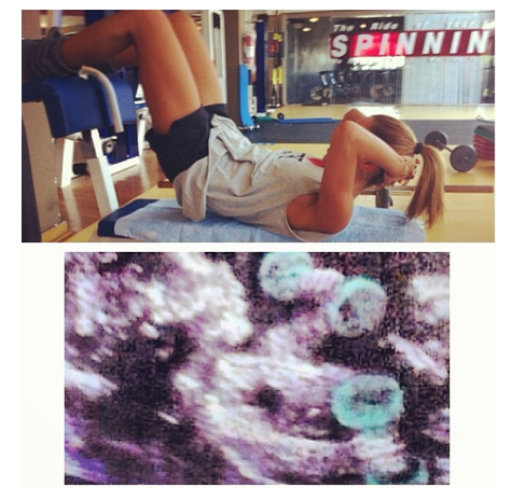 Τι έκανε; Ανέβασε δυο φωτογραφίες στα social media. Η πρώτη είναι πριν από την εγκυμοσύνη της, όταν έχυνε τόνους ιδρώτα για να διατηρεί σε άψογη κατάσταση τους κοιλιακούς της και η δεύτερη είναι ένα υπερηχογράφημα με ένα μωρό που κρατάει βαράκια και γυμνάζεται.