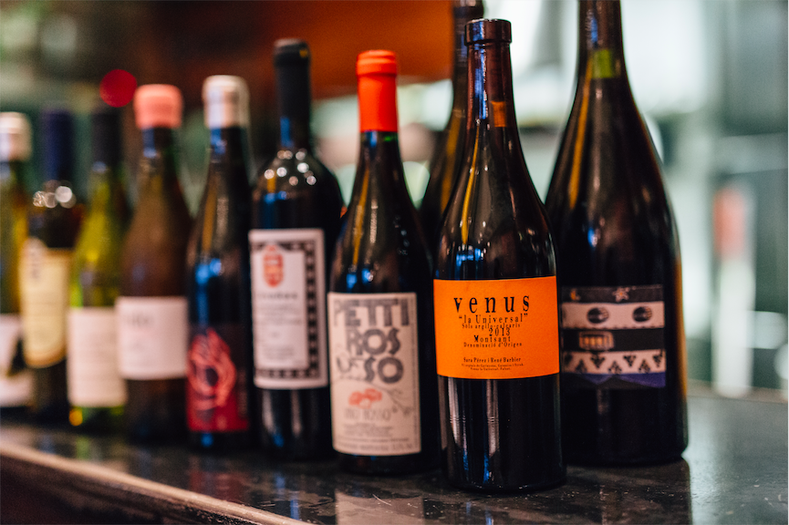 Στο bar κυριαρχεί άφθονο Natural Wine από οινοποιεία όπως του Σκλάβου στην Κεφαλλονιά και του Λίγα στην Πέλλα, Magnums που αγαπάμε, σαμπάνια και αφρώδης οίνος, και σε κάθε λεπτό της βραδιάς μοιραζόμαστε το ποτό μας με το διπλανό τραπέζι.