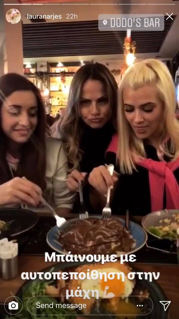 Χθες βρέθηκε με φίλες της Κάλλια Καρτσάκη και Σόφη Πασχάλη για φαγητό και οι τρεις τους, μετά, όπως βλέπετε στο Insta-story που μοιράστηκε, δεν μπόρεσαν να μην παραγγείλουν ένα λαχταριστό, σοκολατένιο επιδόρπιο, που εμείς βλέπουμε και μας τρέχουν τα σάλια. Δεν ξέρουμε τι περιλάμβανε το μενού και τι έφαγαν για κυρίως πιάτο, όμως η αλήθεια είναι πως πλησιάζει και μεσημέρι και ζηλέψαμε πολύ το συγκεκριμένο γλυκό.