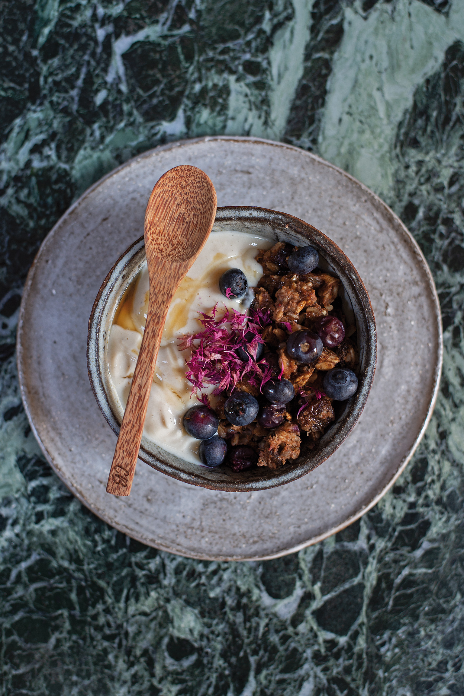 Θερμαίνουμε τον φούρνο στους 180°C στον αέρα. Σε ένα μίξερ χτυπάμε τα καρύδια μέχρι να γίνουν μικρά κομματάκια. Σε ένα κατσαρολάκι ρίχνουμε το γάλα, τη βρόμη και βράζουμε μερικά λεπτά σε χαμηλή φωτιά μέχρι να χυλώσει η βρόμη. Αν χρειαστεί, προσθέτουμε πιο πολύ γάλα ή νερό. Στο μεταξύ, σε ένα μπολάκι λιώνουμε την μπανάνα με το πιρούνι και ρίχνουμε μέσα τα καρύδια, τα blueberries, τους ηλιόσπορους, τη σταφίδα, κανέλα και σιρόπι. Ανακατεύουμε το μείγμα και προσθέτουμε τη βρόμη. Ανακατεύουμε ξανά καλά. Βάζουμε σε ένα πυρίμαχο σκεύος 20×15 και ψήνουμε για 2 λεπτά στον φούρνο. Όταν πάρει χρυσαφί χρώμα, το σερβίρουμε σε βαθύ μπολ μαζί με γιαούρτι, φρέσκα φρούτα και σιρόπι αγαύης.
