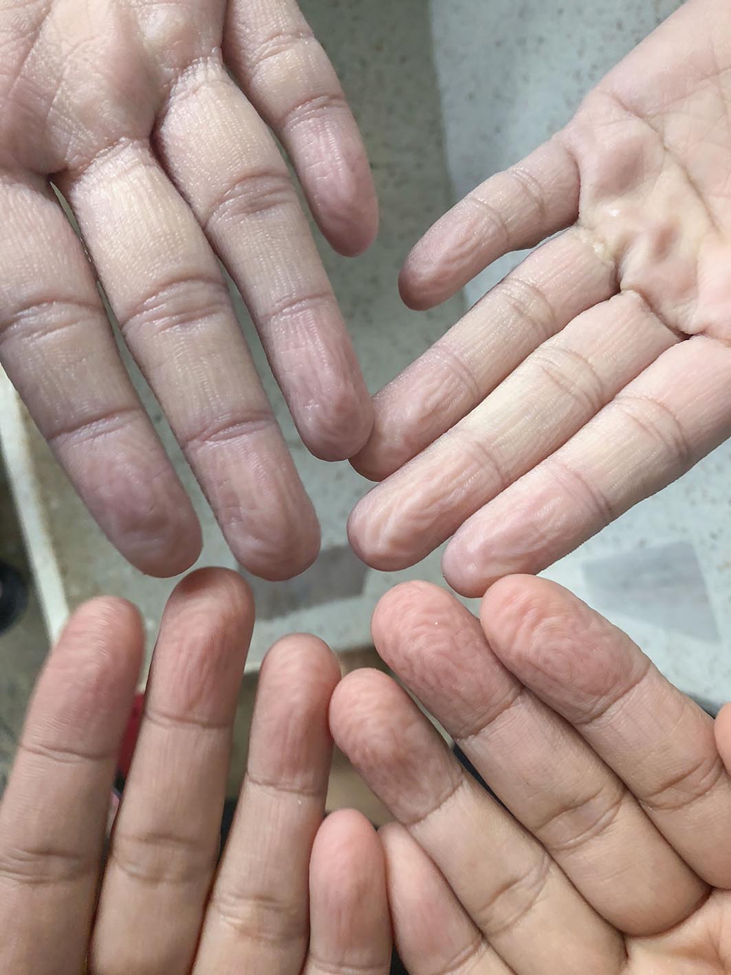 «Όταν τα χέρια και τα πόδια σας έρχονται σε επαφή με το νερό για περισσότερο από λίγα λεπτά, οι ιδρωτοποιοί αδένες στο δέρμα ανοίγουν, επιτρέποντας στο νερό να εισχωρήσει στους ιστούς του δέρματος. Αυτό το επιπλέον νερό μειώνει την αναλογία αλατιού μέσα στο δέρμα.»