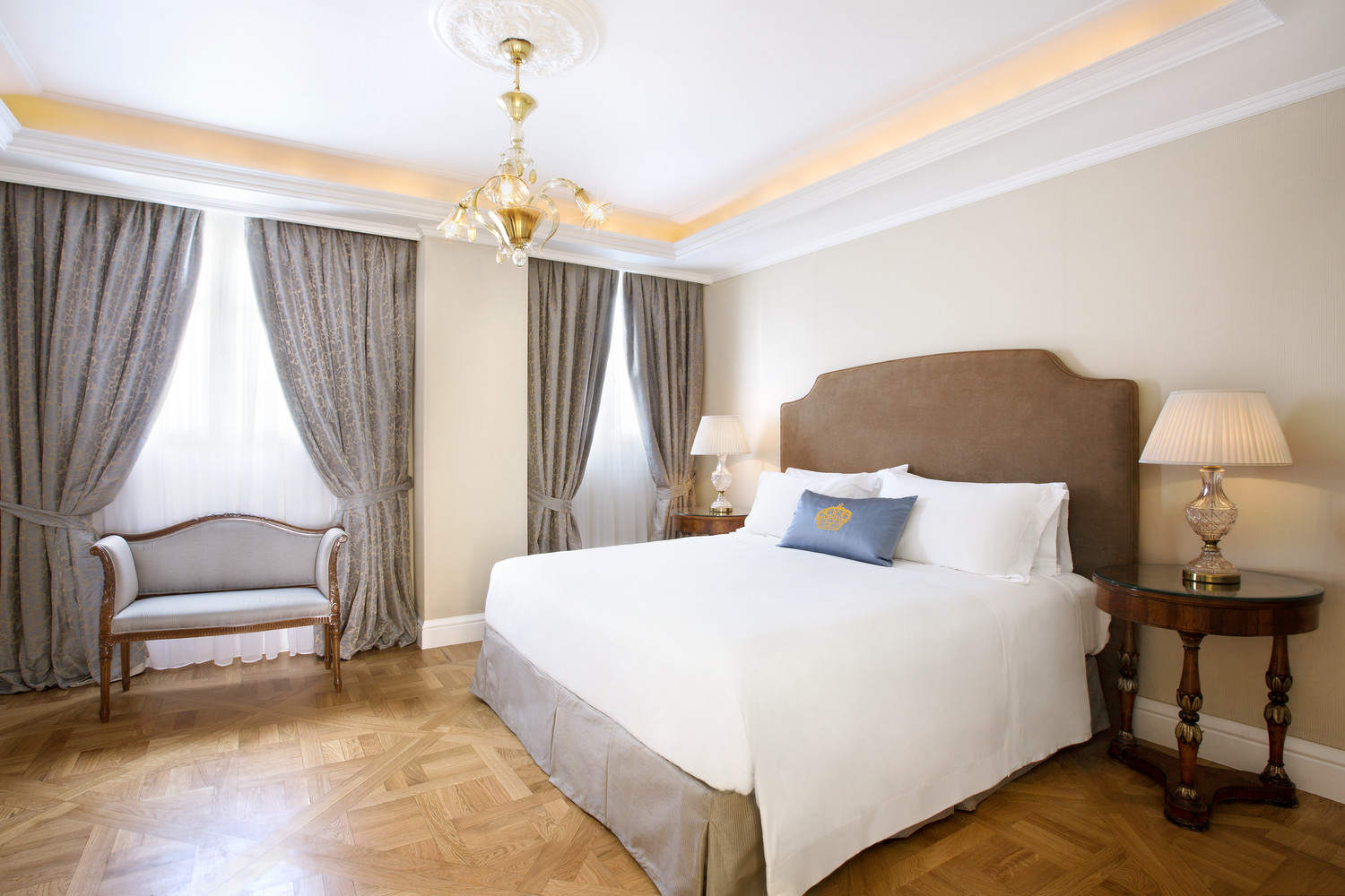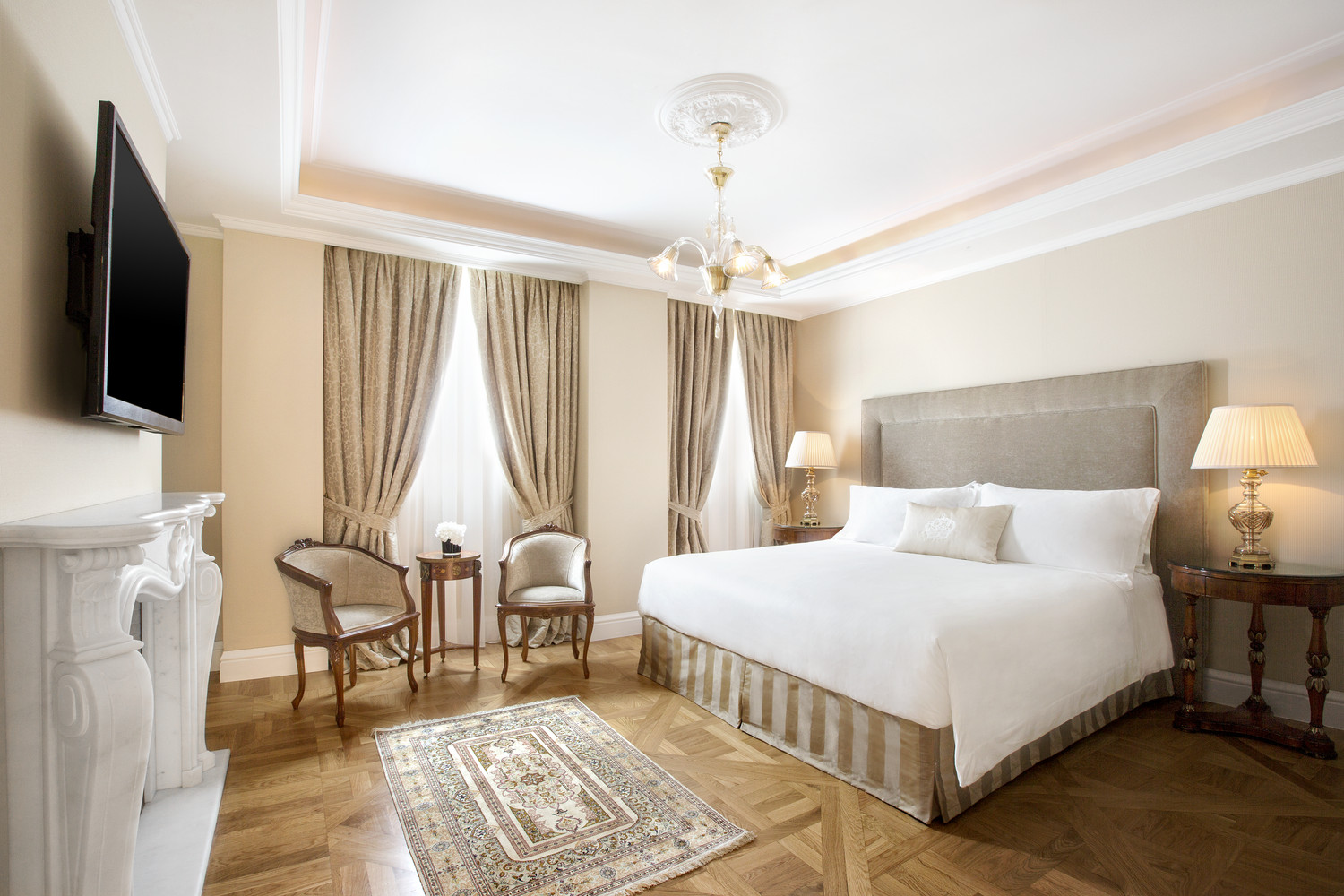 Ανεπιτήδευτη πολυτέλεια, που στοιχειοθετείται στον εσωτερικό χώρο της σουίτας από μεγάλους διάδρομους από μάρμαρο, έπιπλα αντίκες, εκλεπτυσμένο τζάκι, μεταξωτές κουρτίνες, πολύτιμα ανατολίτικα χαλιά και χρωματίζεται με μια απαλή crèmeπαλέτα.