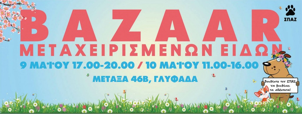 Ο Σύλλογος Προστασίας Αδέσποτων Ζώων των Νοτίων Προαστίων διοργανώνει bazaar μεταχειρισμένων ειδών με σκοπό τη συγκέντρωση χρημάτων για την προστασία, τη φροντίδα και την ιατρική περίθαλψη των αδέσποτων. Το bazaar θα λάβει χώρα την Παρασκευή 9 Μαΐου 17:00-20:00 και το Σάββατο 10 Μαΐου 11:00-16:00, στην οδό Μεταξά 46Β, στη Γλυφάδα.