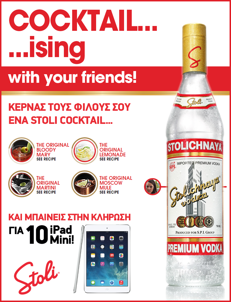 Business and pleasure! Μέχρι τις 23 Ιουνίου, μπορείτε να μπείτε στην ιστοσελίδα της Stoli στο facebook να κεράσετε τους φίλους σας και ταυτόχρονα να μπείτε στην κλήρωση για να κερδίσετε 1 από τα 10 ipad mini.