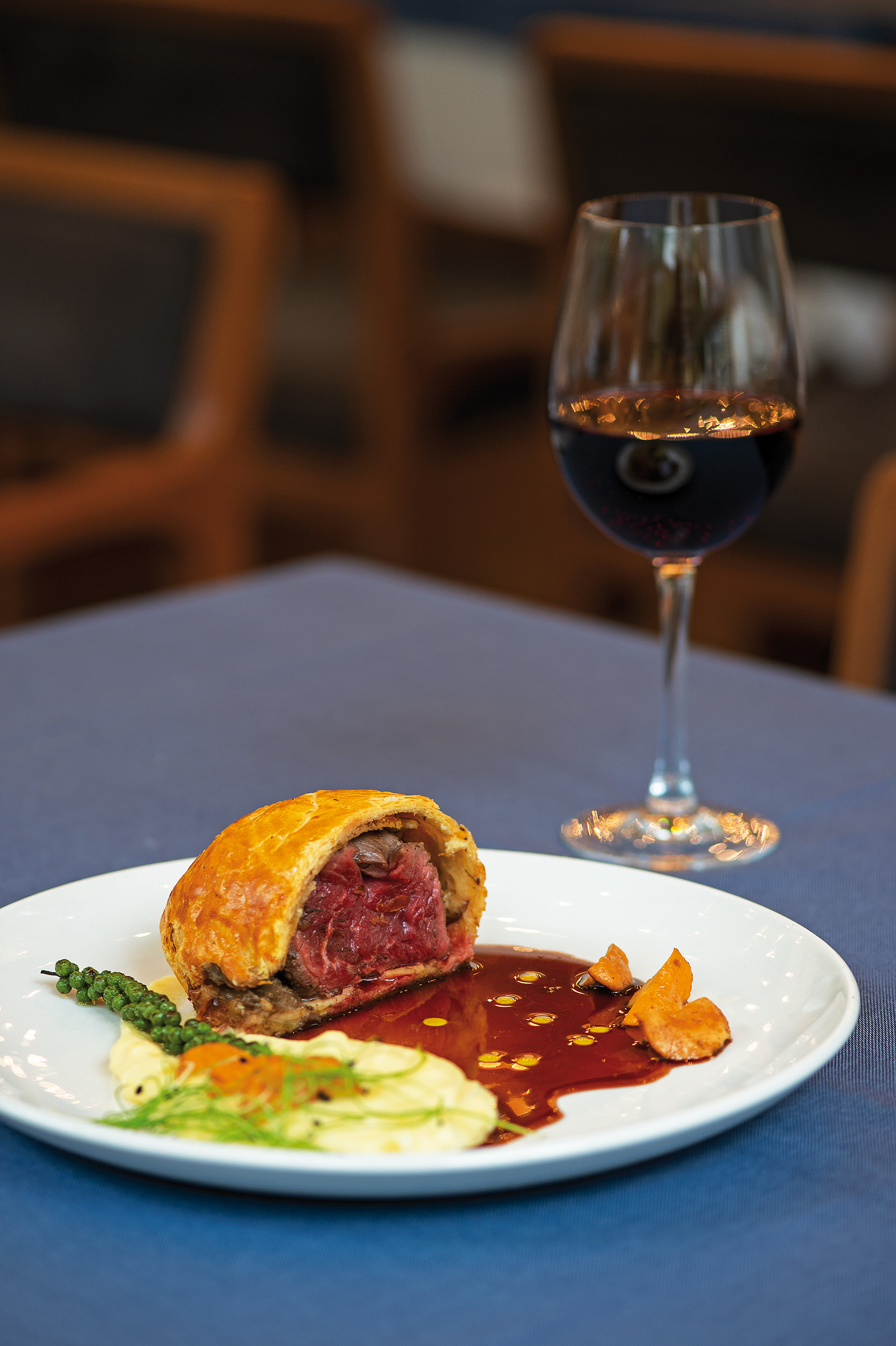 Για τον πουρέ μανιταριών: Σε ένα τηγάνι σοτάρουμε τα μανιτάρια μέχρι να πάρουν χρώμα. Έπειτα προσθέτουμε το κρεμμύδι και το σκόρδο και συνεχίζουμε ώσπου να καραμελώσουν, σβήνουμε με το κρασί και περιμένουμε να εξατμιστεί το αλκοόλ. Προσθέτουμε αλάτι και πιπέρι και περνάμε στο μούλτι μέχρι να γίνουν πουρές. Όταν κρυώσουν, βάζουμε τον μαϊντανό. Σύνθεση: Κόβουμε τη σφολιάτα σε 6 κομμάτια και σε κάθενα από αυτά βάζουμε 1 κρέπα, πουρέ μανιταριών και 1 φιλέτο. Αλείφουμε με αυγό γύρω από τη σφολιάτα. Τυλίγουμε και αλείφουμε πάλι με αυγό. Ψήνουμε στους 180°C για 30-40 λεπτά. Προσέχουμε ώστε το τύλιγμα να είναι όσο πιο σφιχτό γίνεται.