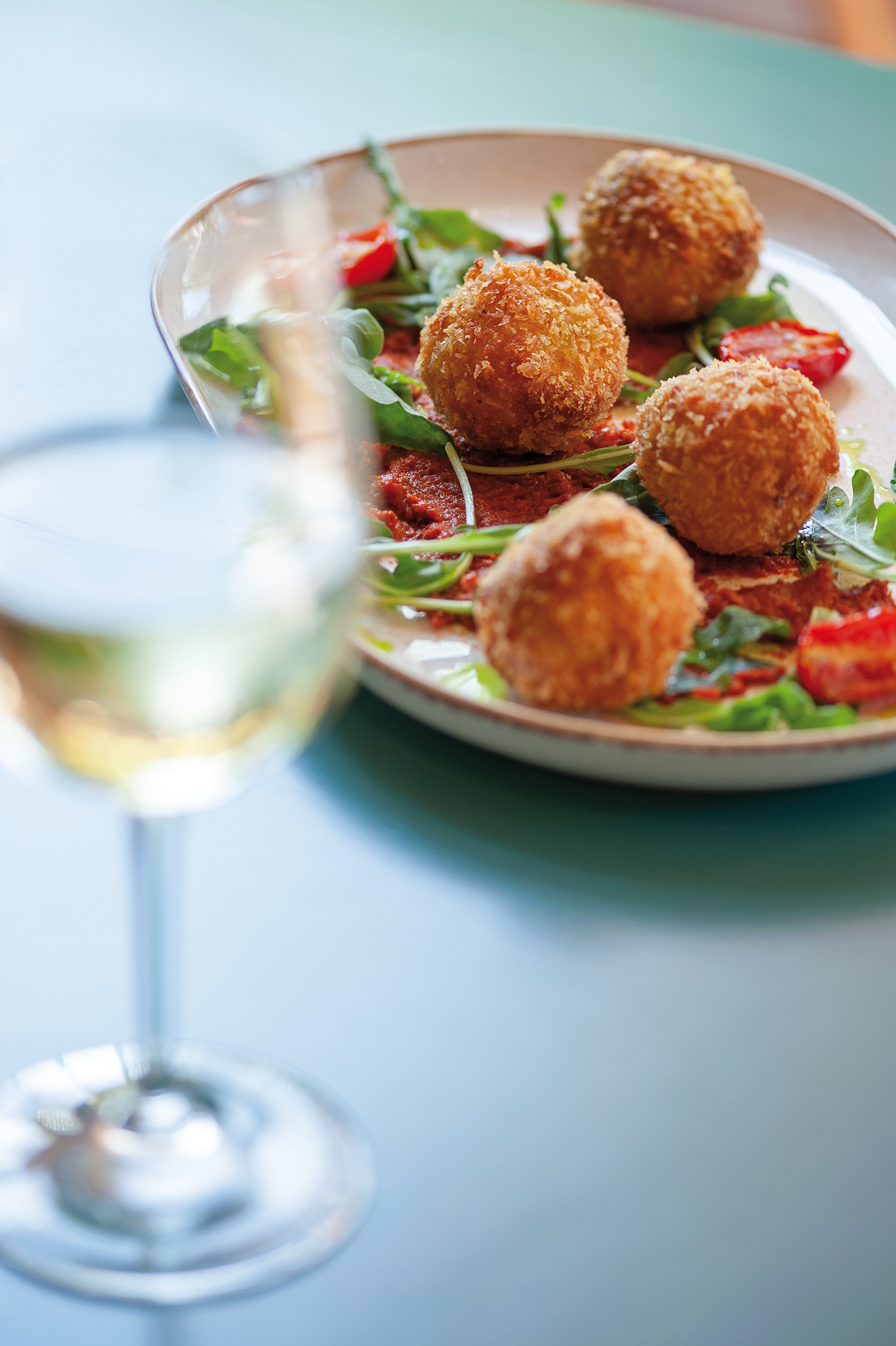 Σε ένα τηγάνι ρίχνουμε το guanciale χωρίς λάδι, προσθέτουμε το κρεμμύδι και σοτάρουμε. Στη συνέχεια ρίχνουμε το ρύζι, ανακατεύουμε για 2 λεπτά και σβήνουμε με το κρασί. Αφού εξατμιστεί το κρασί, ρίχνουμε το νερό και ανακατεύουμε συνέχεια. Όταν το ρύζι τραβήξει όλο το νερό, ρίχνουμε την παρμεζάνα, το βούτυρο, το αλάτι και το πιπέρι και ανακατεύουμε. Αφού κρυώσει το μείγμα, το κάνουμε μπαλάκια των 70 γραμμαρίων, προσθέτουμε τη μοτσαρέλα και πανάρουμε με το αυγό και το πάνκο. Τέλος, τα τηγανίζουμε σε ηλιέλαιο. Για το πέστο: Βάζουμε σε ένα μπλέντερ όλα τα υλικά μαζί, τα χτυπάμε και γαρνίρουμε το πιάτο μας.