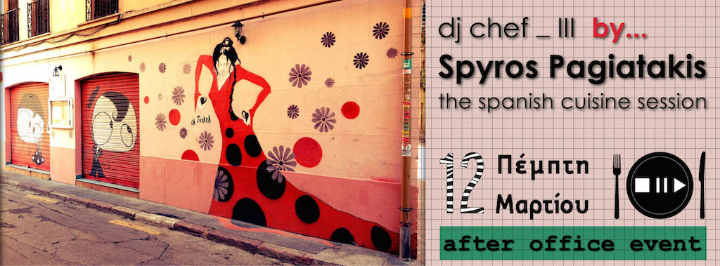 Ένα πρωτότυπο after office event, ένας ραδιοφωνικός παραγωγός και DJ που αφήνει τα mixer των bpm και πιάνει mixer της κουζίνας και ένα από τα καλύτερα στέκια της Πλατείας Αγ. Ειρήνης! Μετά τα πολύ επιτυχημένα Dj Chef food events με γεύσεις εμπνευσμένες από την Ιταλική και Αμερικανική κουζίνα, το Spollati, το all day cafe bar restaurant της πλατείας Αγ. Ειρήνης παρουσιάζει τη συνέχεια αυτού του πρωτότυπου after office event με τον Σπύρο Παγιατάκη για άλλη μια φορά όχι στις μουσικές επιλογές αλλά στις γεύσεις! Ο Σπύρος Παγιατάκης αφήνει και πάλι τα dexx της μουσικής και πιάνει τα dexx της μαγειρικής! Μετά το ραδιόφωνο (En Lefko 87,7) τα dj sets και το food blogging και τα πολύ θετικά σχόλια των προηγούμενων DJ CHEF sessions αναλαμβάνει για ένα ένα ακόμα απόγευμα το menu του Spollati και αυτή τη φορά δημιουργεί γεύσεις εμπνευσμένες από την Ισπανική κουζίνα.