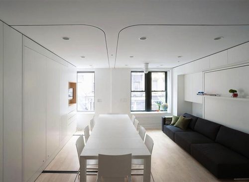 Κάθε εκατοστό χρήσιμου χώρου είναι πολύτιμο. Μια επεκτάσιμη τραπεζαρία και ένα αναδιπλούμενο κρεβάτι κρατούν το στούντιο καθαρό και νοικοκυρεμένο, ενώ υπάρχει επίσης η δυνατότητα να χωρίσετε το δωμάτιο σε μικρότερους χώρους που έχουν τη δική τους χρησιμότητα. Οι αρχιτέκτονες εγκατέστησαν έναν κινούμενο τοίχο που σύρεται σε γραμμές που υπάρχουν στο πάτωμα κι έτσι μπορεί να δημιουργήσει μια επιπλέον κρεβατοκάμαρα.