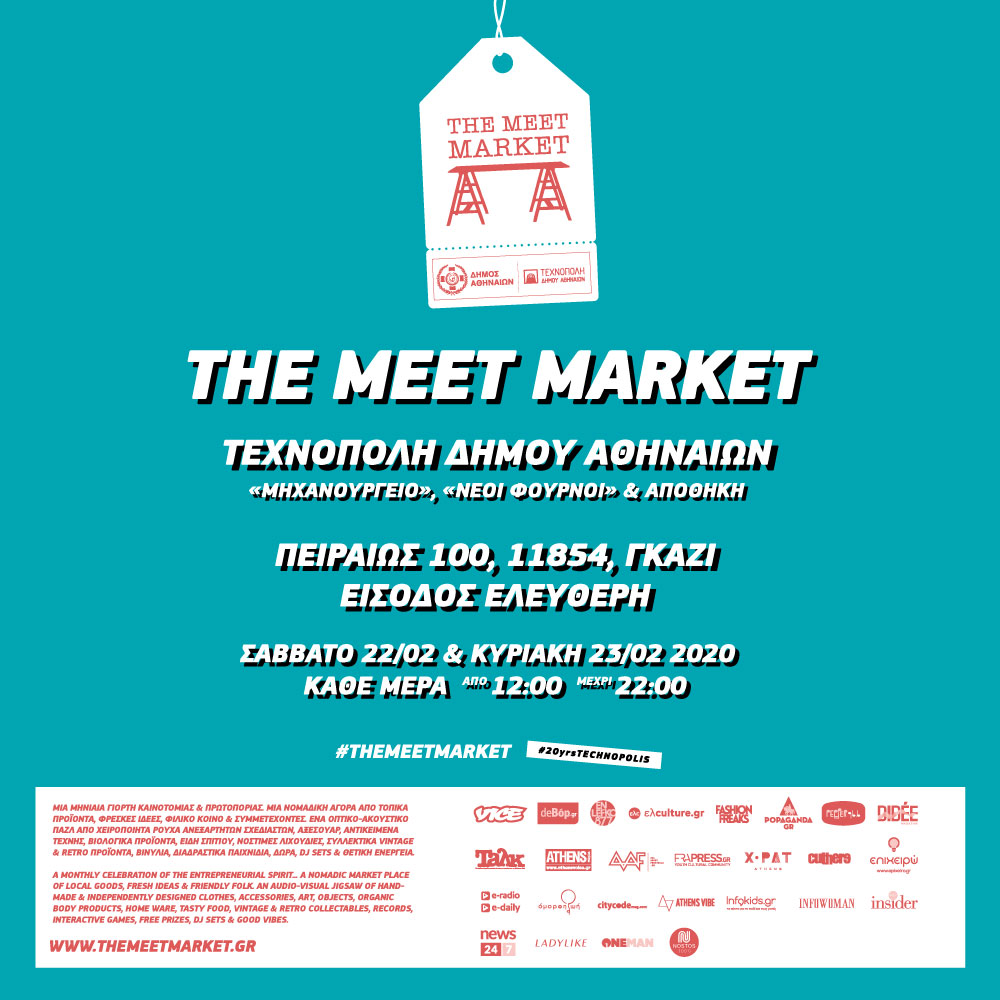 The Meet Market: Μια διήμερη γιορτή καινοτομίας και πρωτοπορίας. Μία νομαδική αγορά από τοπικά προϊόντα, φρέσκιες ιδέες, φιλικό κοινό και συμμετέχοντες. Ένα οπτικο-ακουστικό παζλ από χειροποίητα ρούχα ανεξάρτητων σχεδιαστών, αξεσουάρ, αντικείμενα τέχνης, βιολογικά προϊόντα, είδη σπιτιού, νόστιμες λιχουδιές, συλλεκτικά vintage & retro προϊόντα, βινύλια, διαδραστικά παιχνίδια, δώρα, DJ sets και θετική ενέργεια!