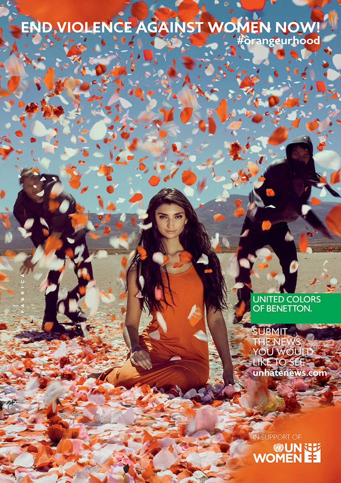 Νέα Υόρκη, 24 Νοεμβρίου 2014. Μια ομάδα ανδρών «λιθοβολούν» μια γυναίκα με πέταλα λουλουδιών. Με το δυνατό αυτό συμβολισμό, υποστηρίζεται η νέα καμπάνια της δράσης των Ηνωμένων Εθνών για την προώθηση της ισότητας των φύλλων και τη χειραφέτηση των γυναικών. Η United Colors of Benetton στηρίζει ενεργά από τις 25 Νοεμβρίου έως τις 10 Δεκεμβρίου, τη δράση των Ηνωμένων Εθνών με αφορμή την Παγκόσμια Ημέρα εξάλειψης της βίας κατά των γυναικών.