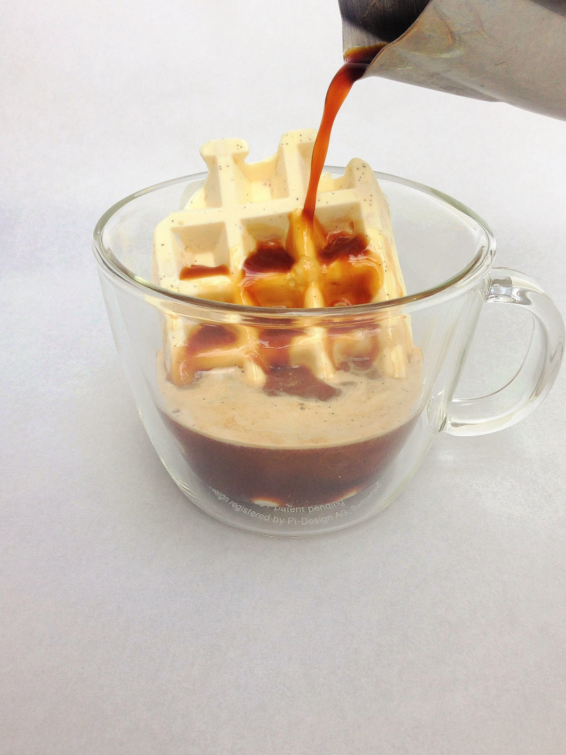 O Ansel όμως είχε μια διαφορετική εκδοχή στο μυαλό του. O δημιουργός από τη Νέα Υόρκη, σκέφτηκε να βάλει στην εξίσωση και μια βάφλα, η οποία είναι φτιαγμένη από παγωτό και περιχύνεται με καφέ espresso από σιρόπι σφενδάμου.