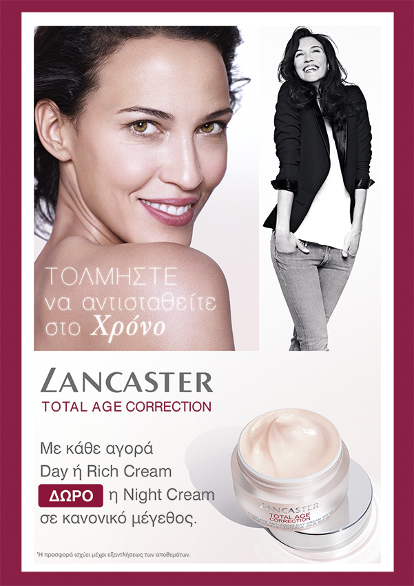 Για να γιορτάσετε μαζί με τη Lancaster «τη νίκη ενάντια στο χρόνο», το αγαπημένο μας brand σας προσφέρει μια μοναδική ευκαιρία: από σήμερα 31 Μαρτίου, σε επιλεγμένα καταστήματα καλλυντικών και μέχρι εξάντλησης των αποθεμάτων, μαζί με κάθε αγορά της κρέμας ημέρας TOTAL AGE CORRECTION, παίρνετε ΔΩΡΟ την κρέμα νύχτας σε κανονικό μέγεθος. Και κάτι ακόμα… αυτή τη στιγμή που σας γράφουμε, όλα τα προϊόντα Lancaster έχουν έκπτωση 35%. Αυτό σημαίνει ότι αγοράζετε με έκπτωση και παίρνετε και δώρο!