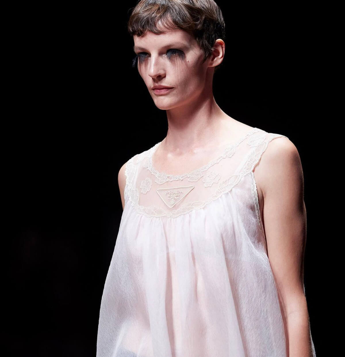 Βλεφαρίδες με εφέ φτερού και μήκος που βαραίνει το μάτι πρόσφεραν τη δική τους σκιά σε ένα beauty look που συζητήθηκε πολύ. Ο οίκος Prada επένδυσε στα καθαρά πρόσωπα, κάνοντας ωστόσο focus στα μάτια των μοντέλων μ’ ένα στοιχείο που κάθε άλλο παρά διακριτικό ήταν. Ιδανικές για να κάνουν αέρα!