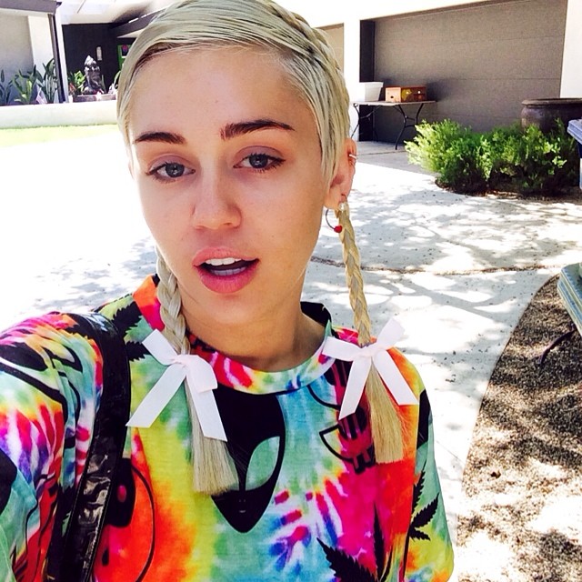 Επιδερμίδα φρέσκια όπως αρμόζει στην ηλικία της, αμακιγιάριστη, με πολύχρωμο τοπ και δύο πλατινέ κοτσιδάκια με κορδέλες. Είναι προφανές ότι η Miley αυτό το Σαββατοκύριακο αποφάσισε όχι να μας δείξει την girly πλευρά της αλλά να τη χλευάσει δημόσια όμως μας έβαλε σε σκέψεις.