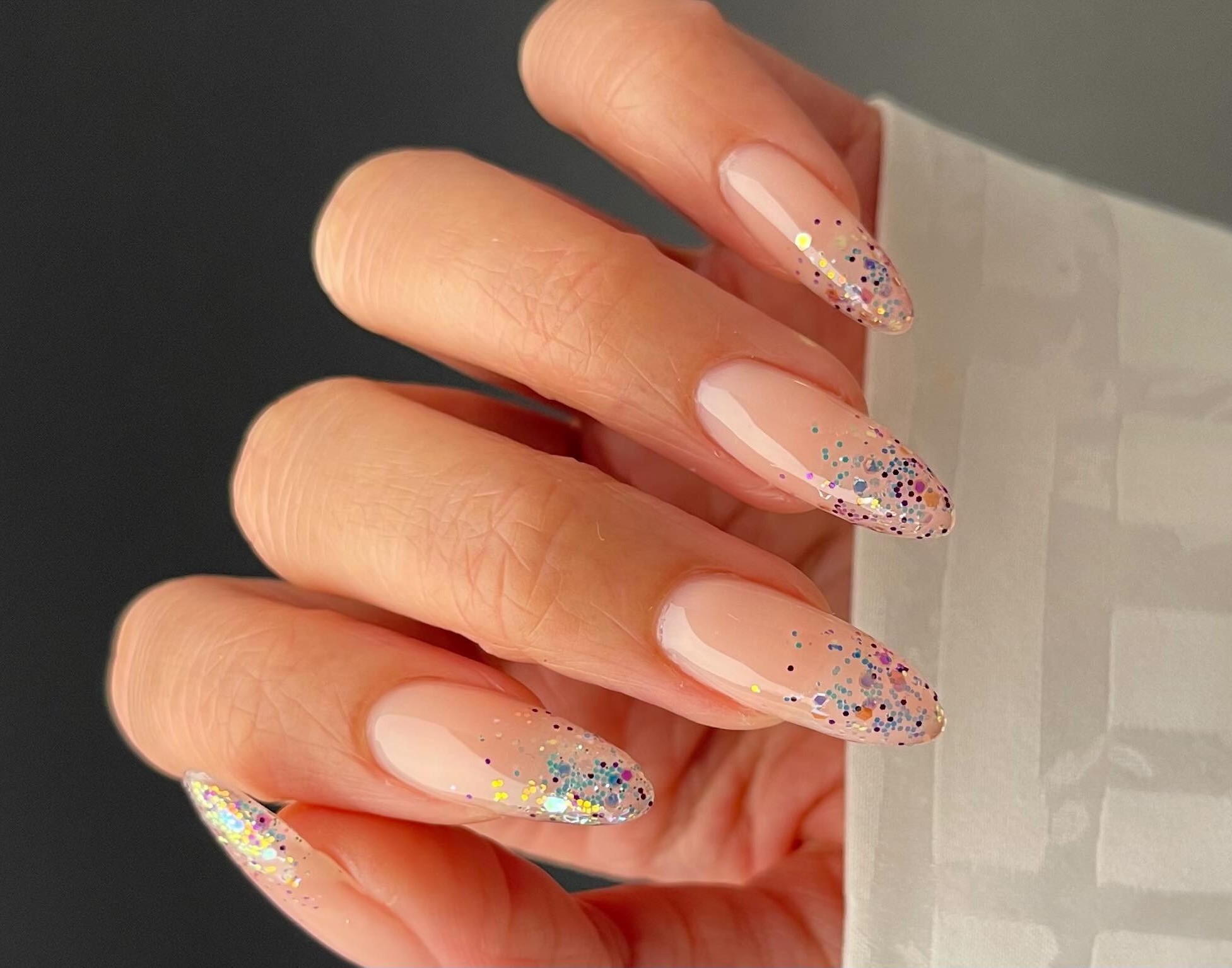 Γαλλικό μανικιούρ σε αμυγδαλωτά νύχια με γκλίτερ